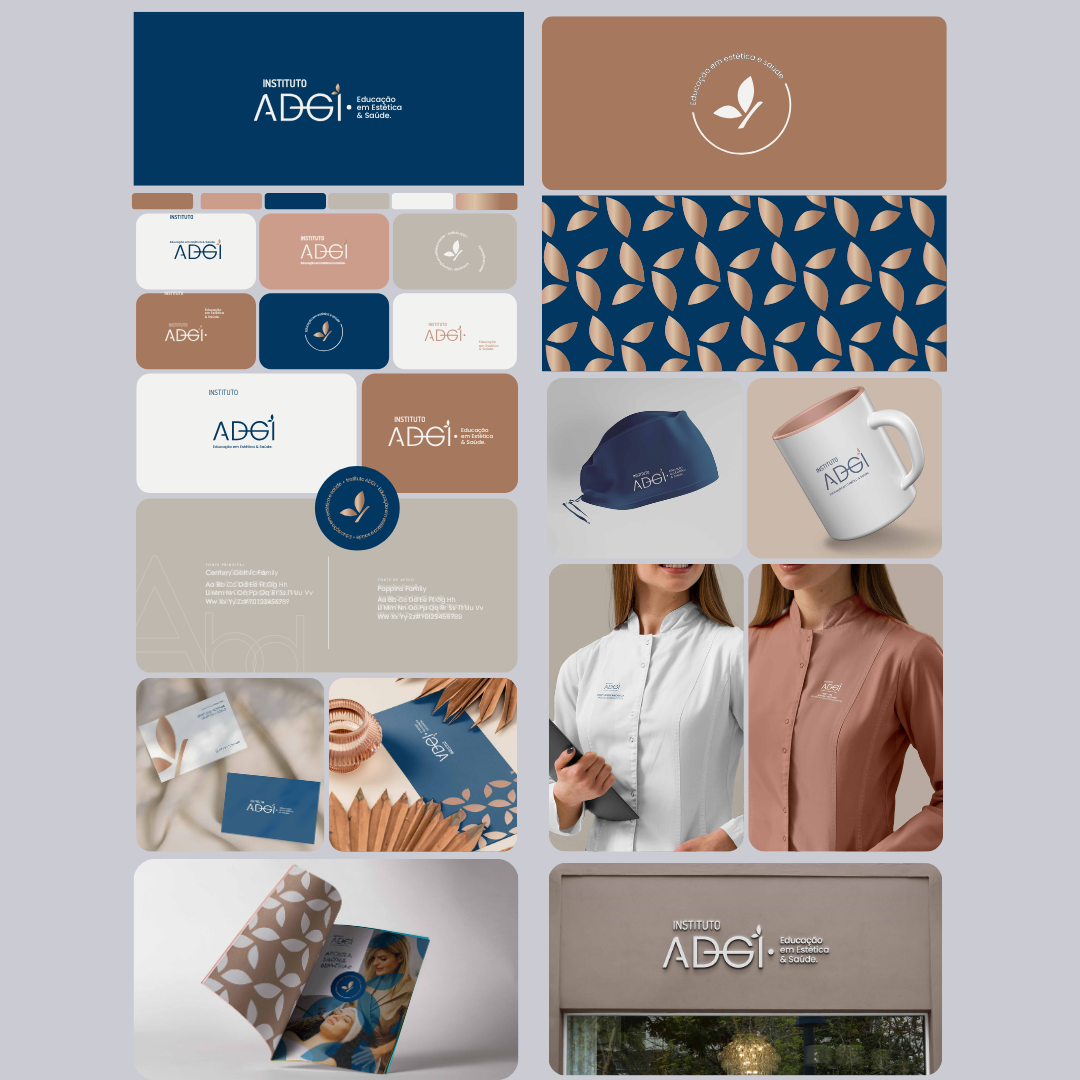 Desenvolvimento completo da identidade visual para o Instituto ADGi, com foco em transmitir profissionalismo, confiança e sofisticação no segmento de educação em estética e saúde.
